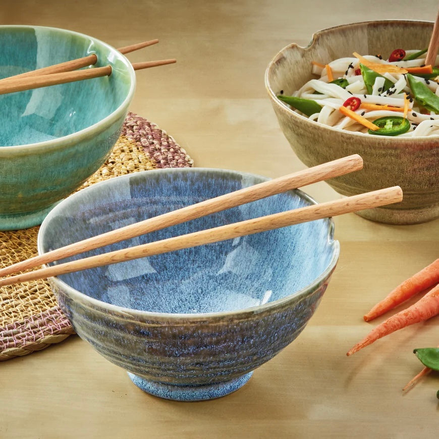 Elevate your dining experience with the Akira Noodle Bowl Set, featuring three stylish options. Enjoy cozy ramen nights or simple dinners with warm taupe, refreshing aqua, or deep blue glazes, complemented by bamboo chopsticks. Perfect for adding a touch of fun to any meal!