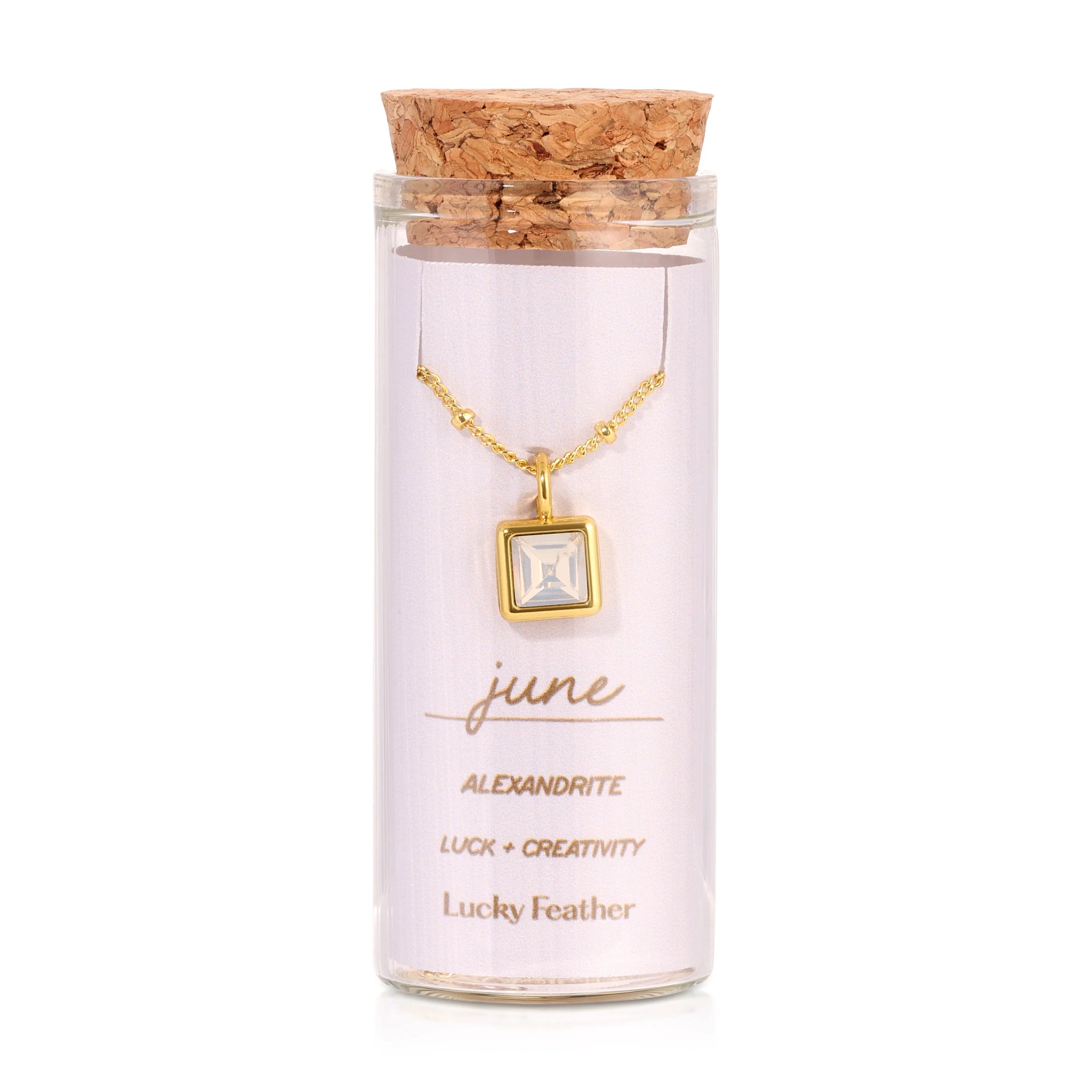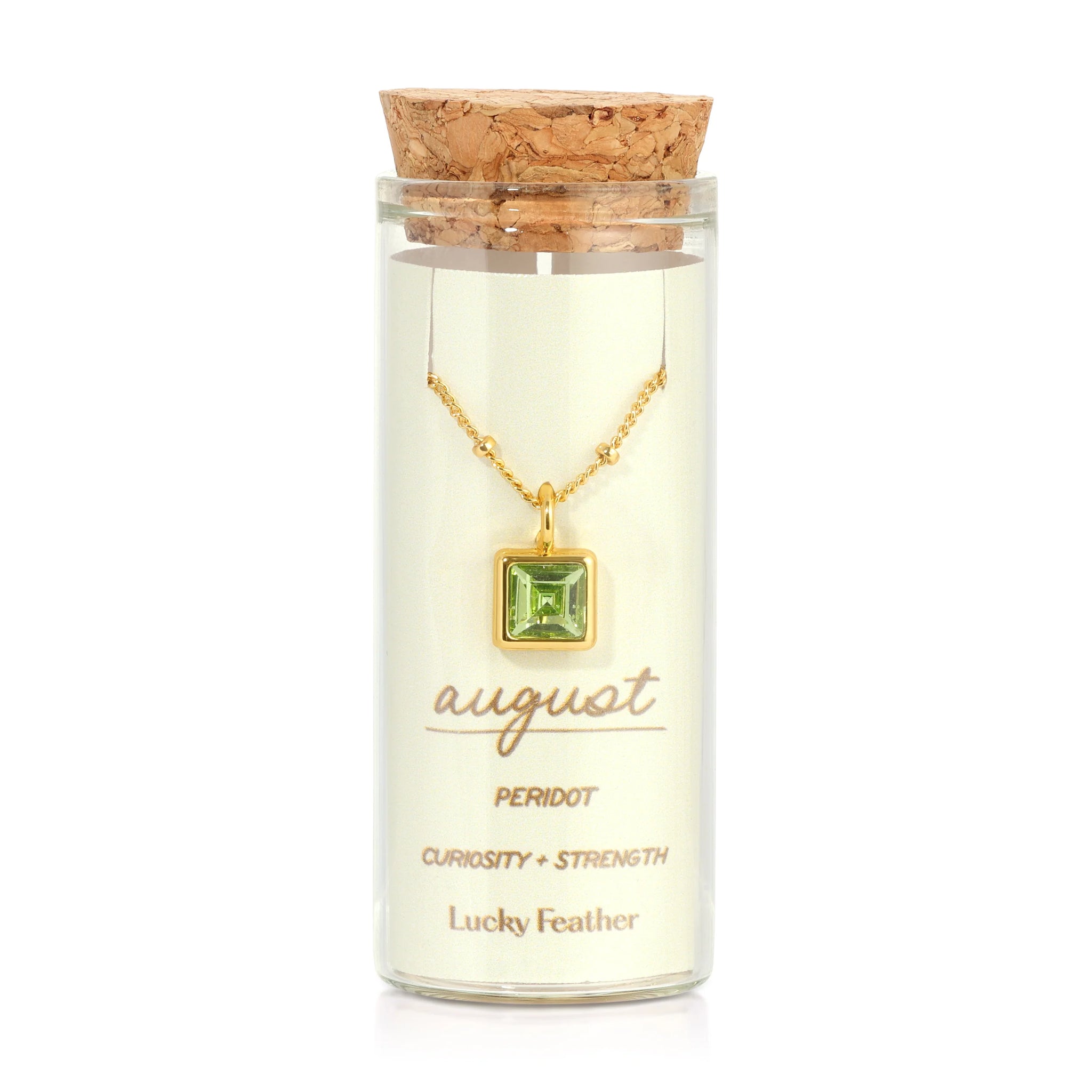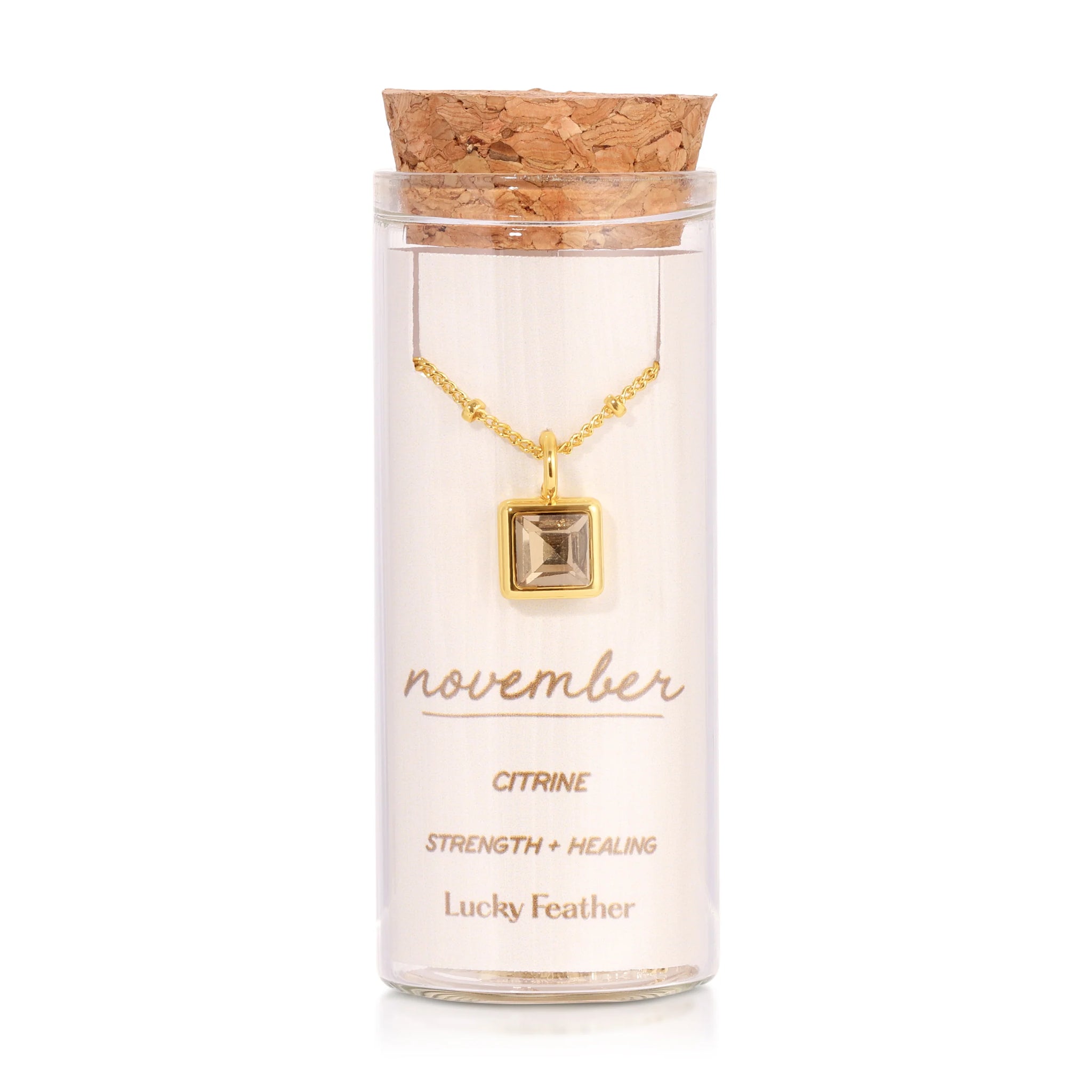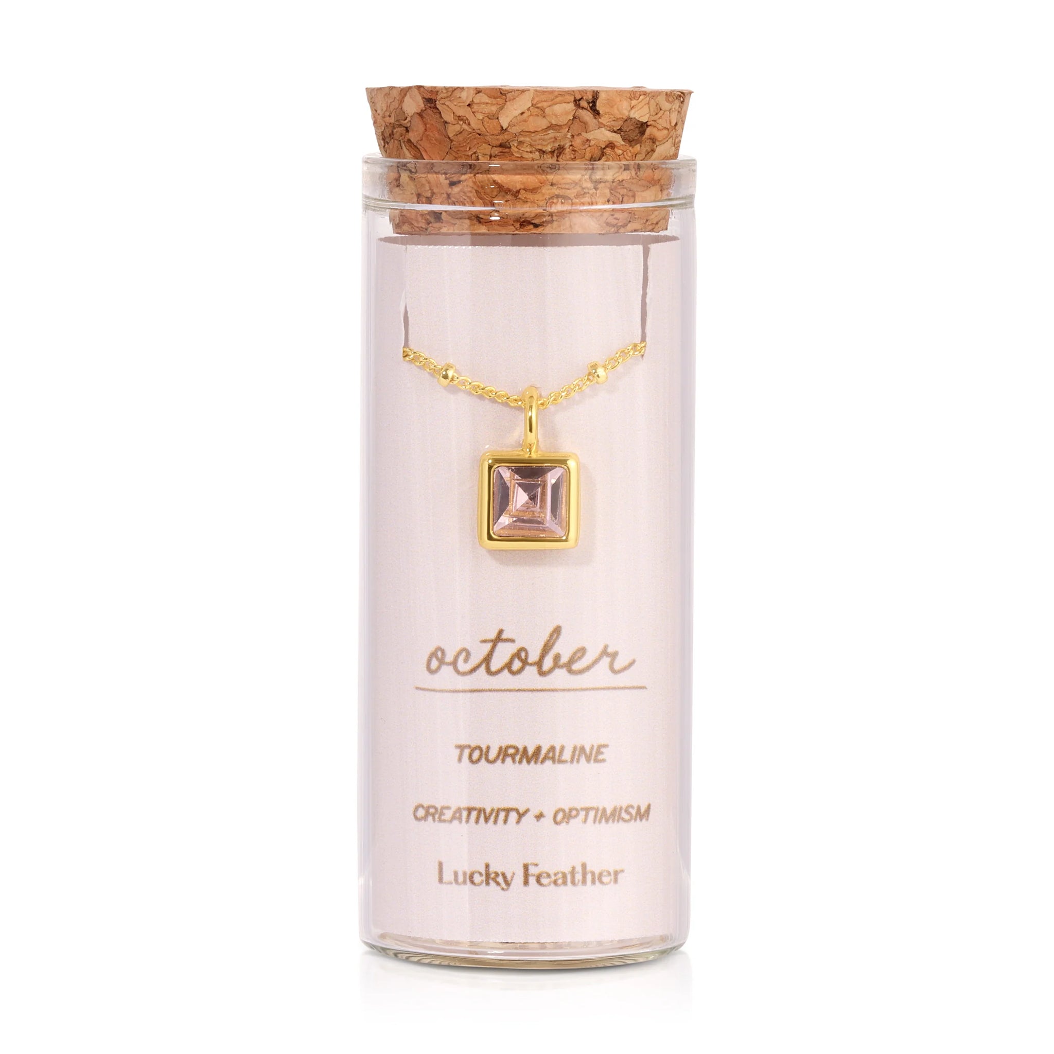 Birthstone Bottle Necklace. Each month's birthstone is captured in a sparkling, 14k gold-dipped glass crystal pendant (approx. 8mm). The adjustable 16-18" chain features delicate beaded accents and comes in a charming glass bottle with a cork top and month insert, making it ready for gifting.