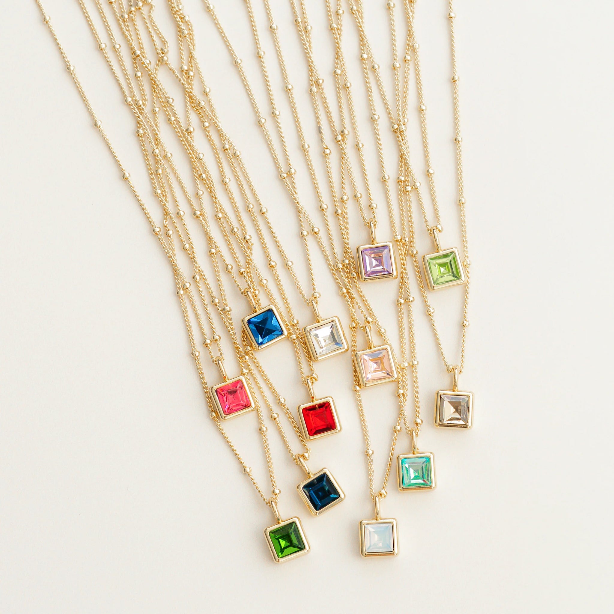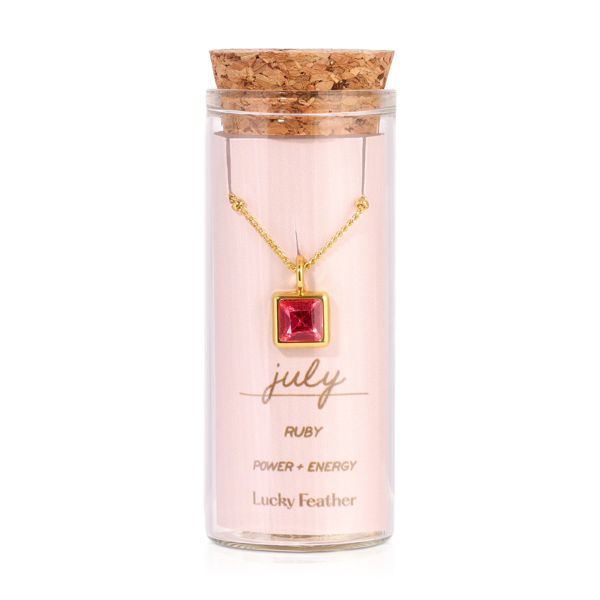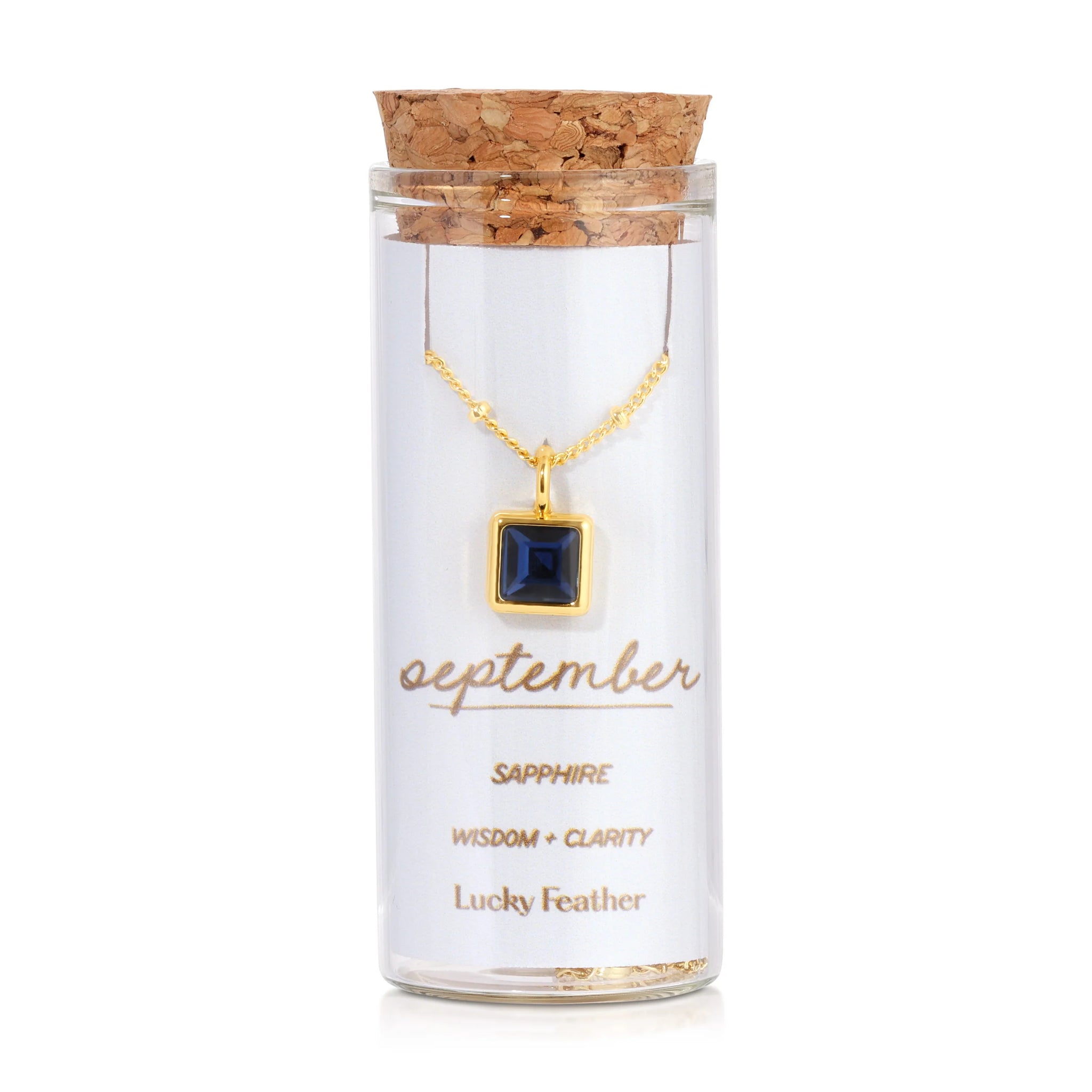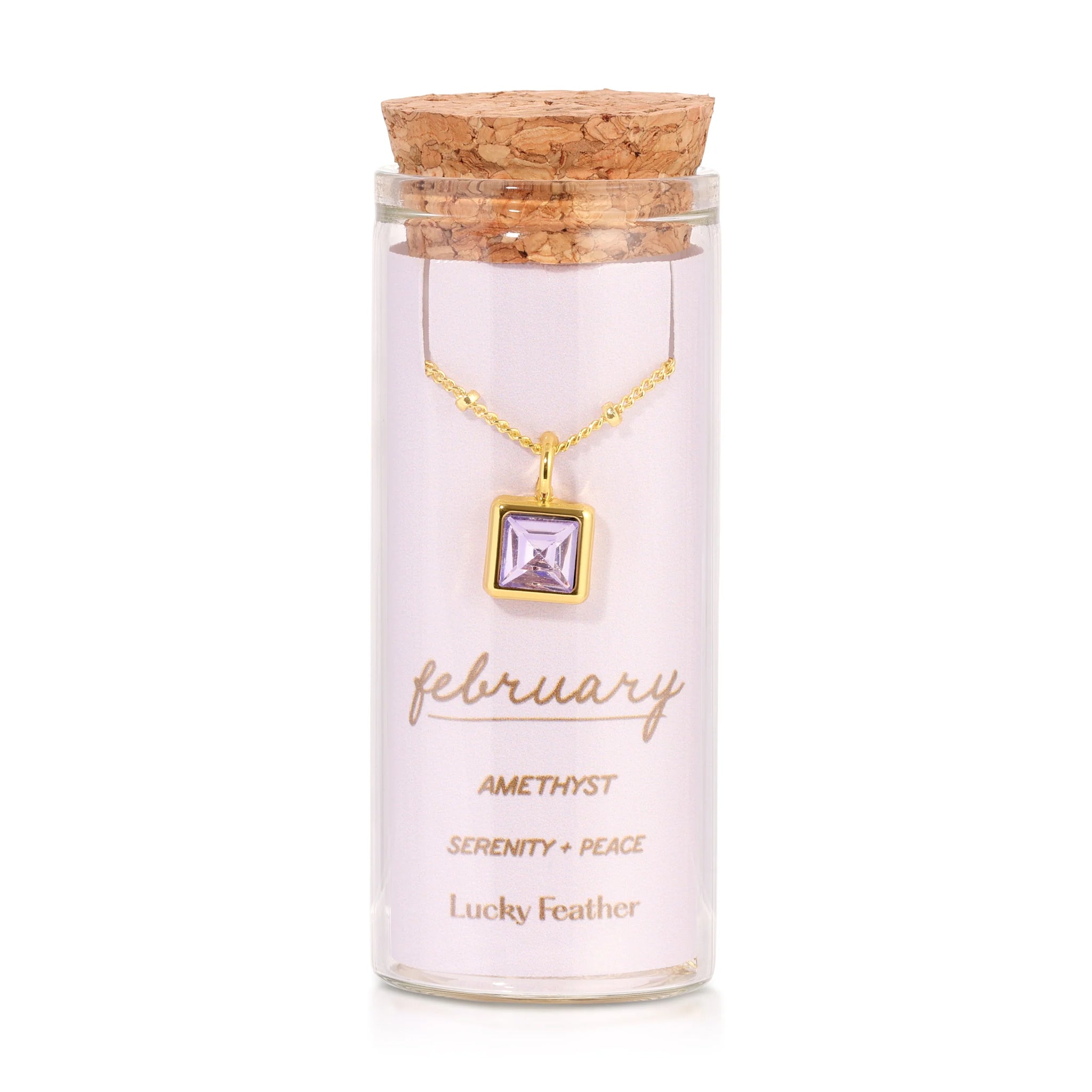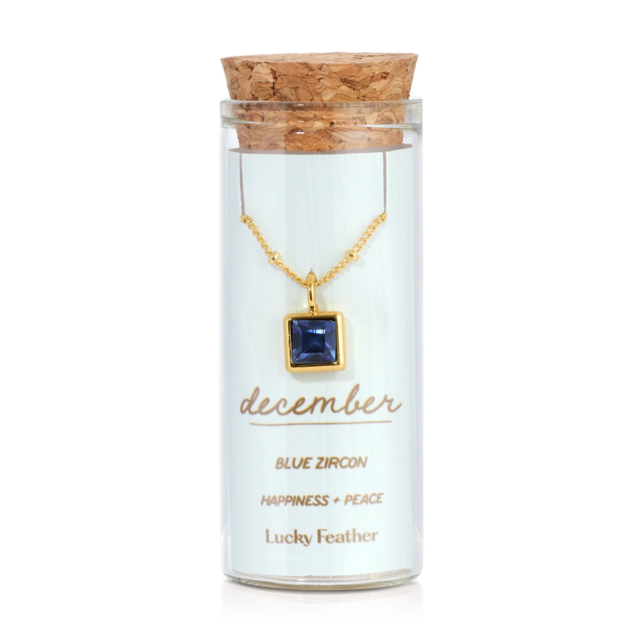 Birthstone Bottle Necklace. Each month's birthstone is captured in a sparkling, 14k gold-dipped glass crystal pendant (approx. 8mm). The adjustable 16-18" chain features delicate beaded accents and comes in a charming glass bottle with a cork top and month insert, making it ready for gifting.