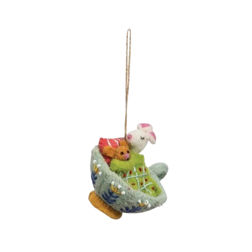 These Felt Tea Cup Mouse Ornaments come in two delightful styles - a charming blue tea cup or an adorable pink teacup. Perfect for the holiday season, these ornaments add a touch of whimsy to any decor. Each sold separately.