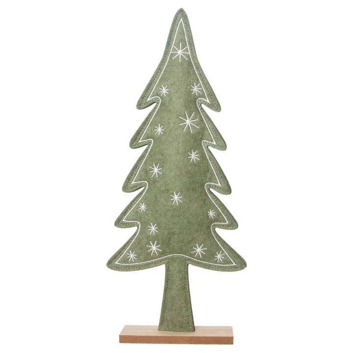Expertly crafted, the Felted Tree with Stars adds a touch of natural elegance to any space. This 14" tall sage green tree features delicate felted details and wooden base, accented with stars for a whimsical touch. Perfect for holiday or year-round decor.