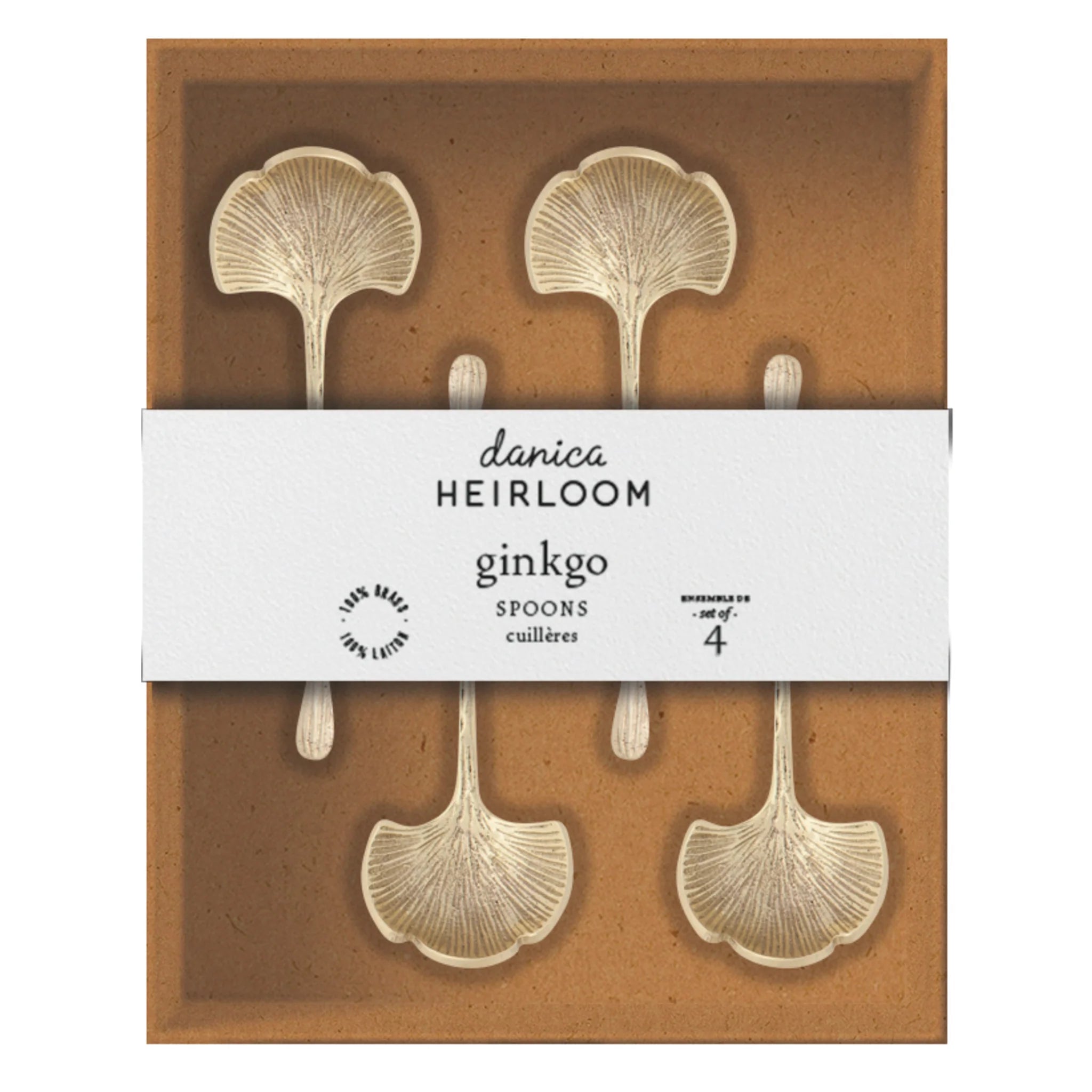 Upgrade your kitchenware with our Ginkgo Spoon set: four durable brass spoons, made of 100% brass and dishwasher safe.