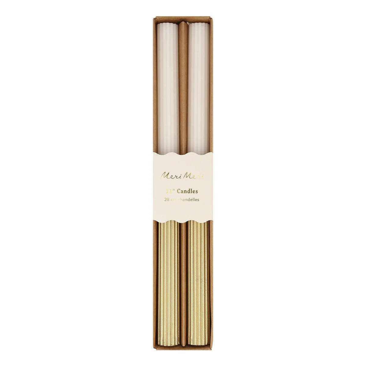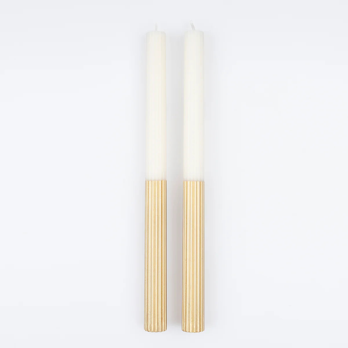 Add a touch of elegance to your special occasions with our Gold Dipped Table Candles. Made with ivory wax and a gold dipped section, these unscented candles provide a soft, sophisticated glow for weddings, anniversaries, and more. With a burn time of approximately 7 hours, they are perfect for use as a centerpiece or mantel decoration. Plus, they make a great reusable host gift.