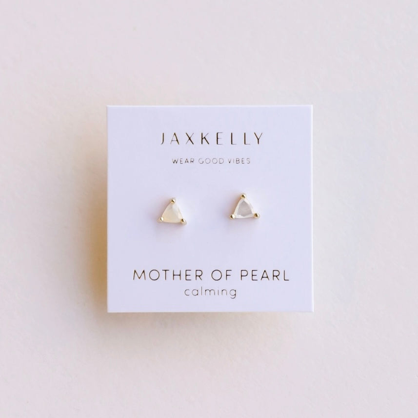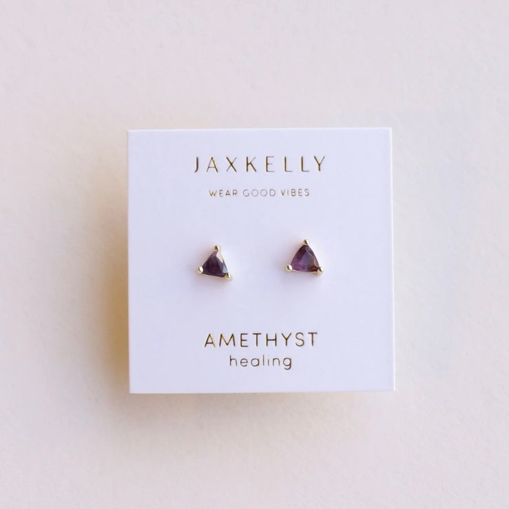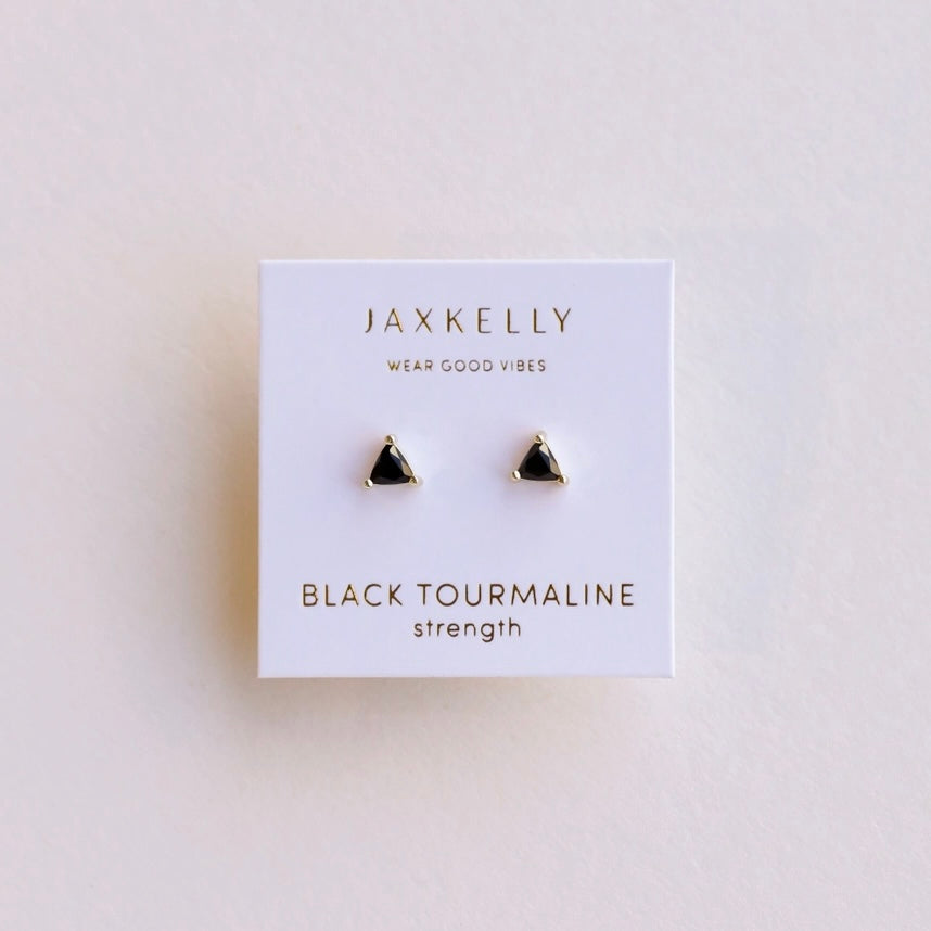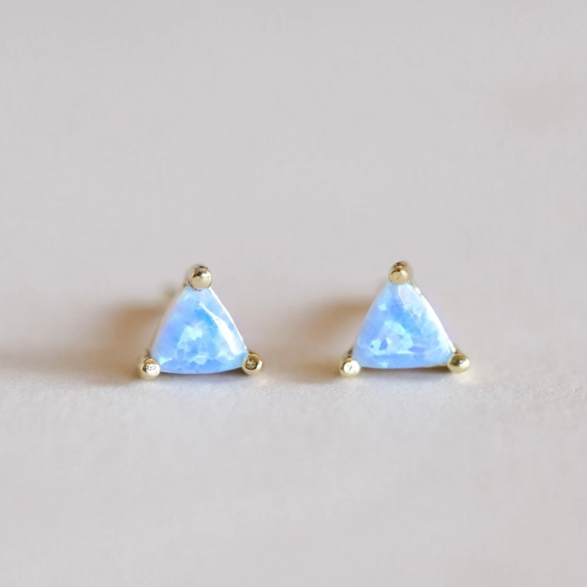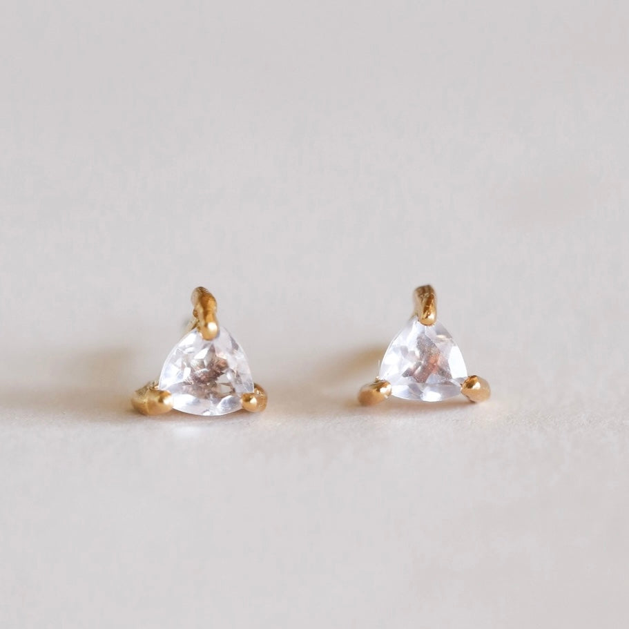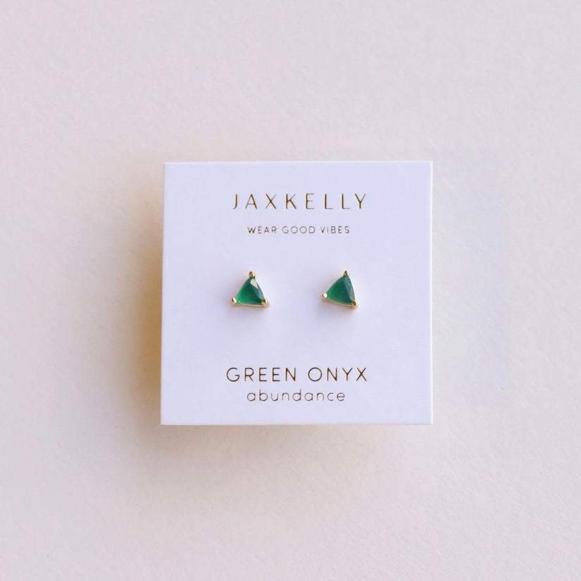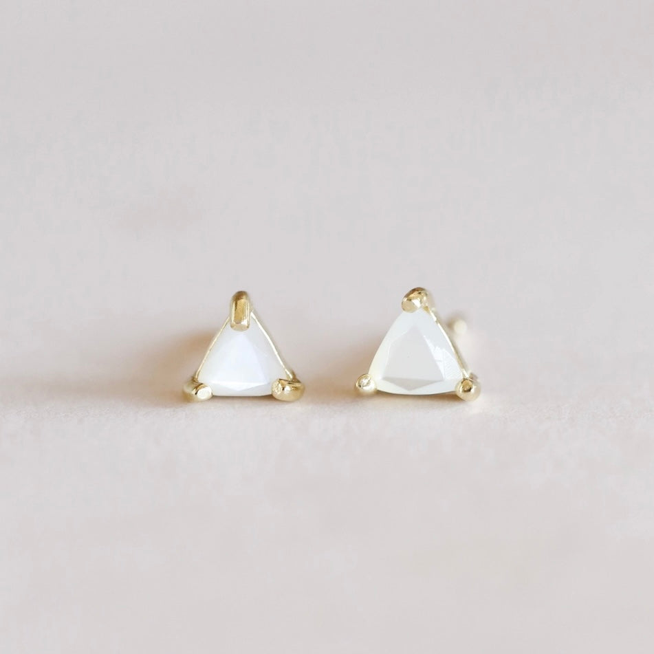 The Mini Gem Studs feature a triangular stone set in prong settings, available in four variations: Green Onyx, Black Tourmaline, Amethyst, and Lab-grown Fire Opal. Constructed from tarnish-free sterling silver with 18K gold plating, these hypoallergenic earrings ensure durability and comfort.