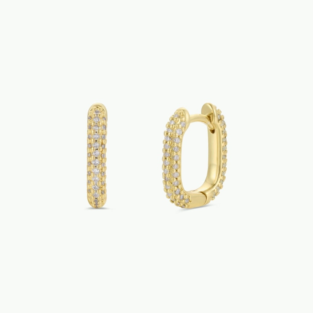 The Pave Gold Hoop Earrings feature a modern square cut design and are adorned with rows of white pave cubic zirconia (CZ) stones, offering a sophisticated look.