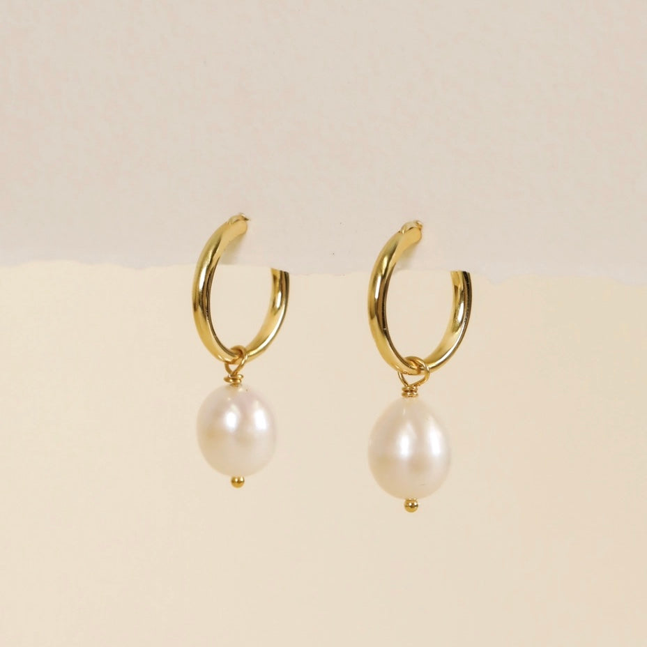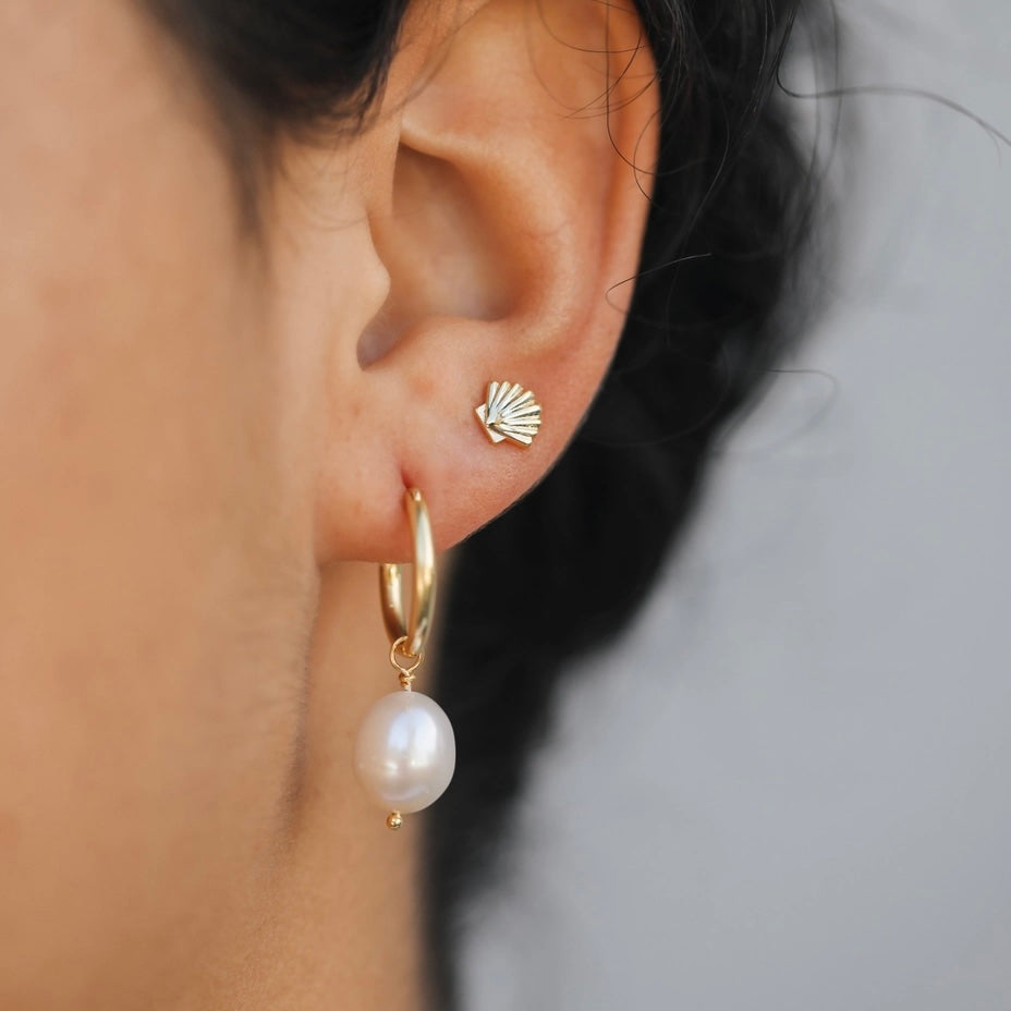 The Pearl Drop Gold Earrings feature a minimalist design, combining 18k gold plating over brass with sterling silver posts for durability. The 16mm hoop diameter and 8mm mother-of-pearl drop create an elegant profile. With a tarnish-free coating, these earrings are resistant to water and sweat, ensuring long-lasting wear.