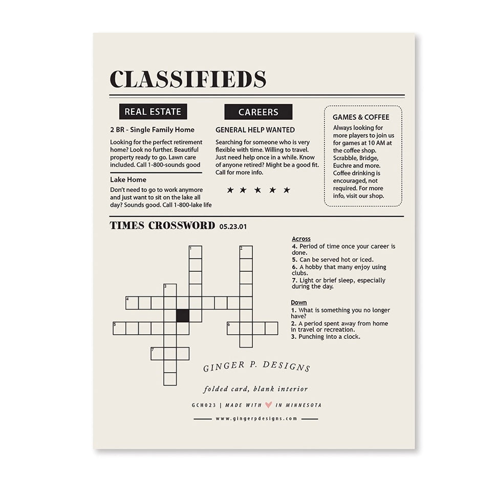 Retirement Times Card available at Bench Home