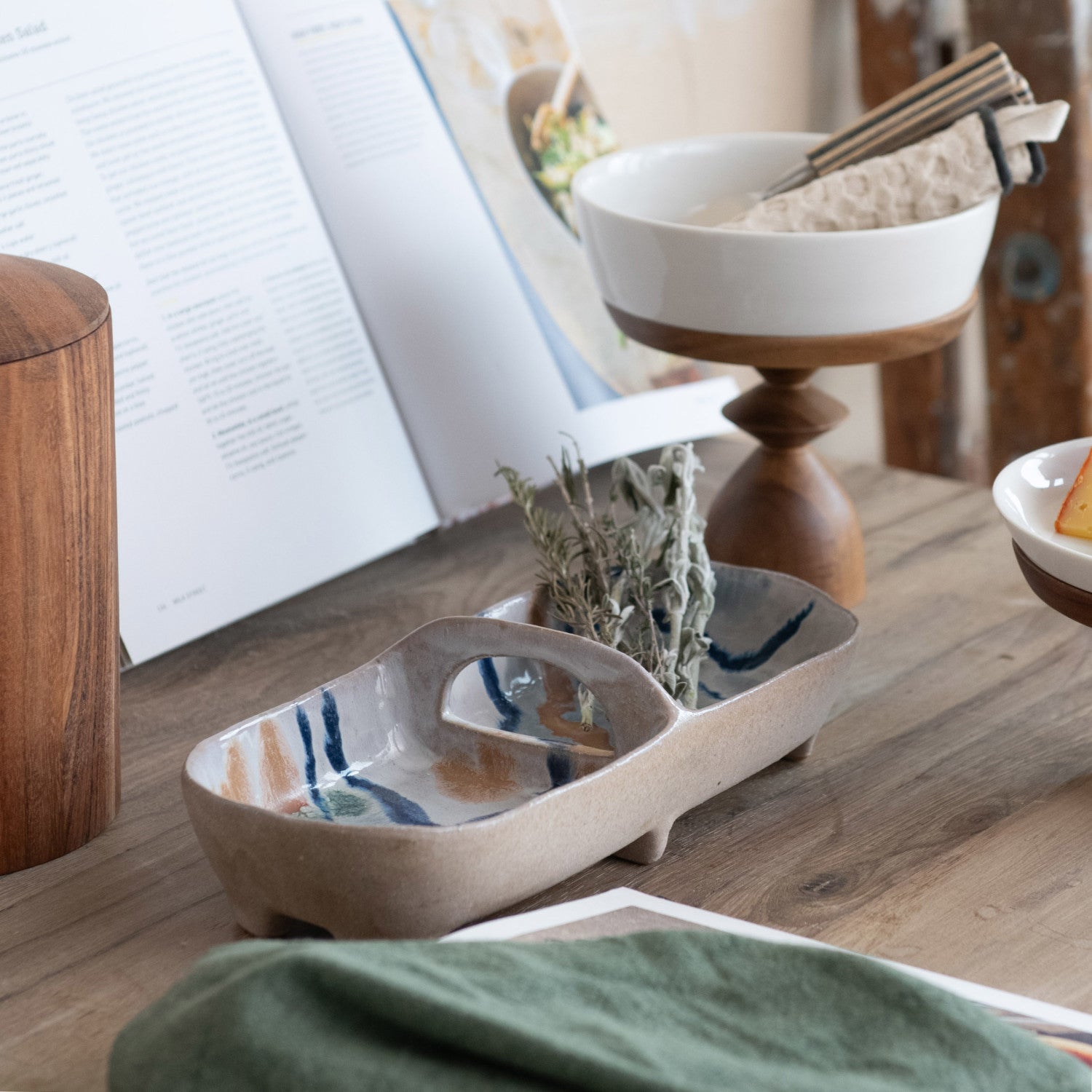 Crafted with a dazzling blue and tan glaze, this dish adds a touch of elegance to any table setting. Plus, its 2 sections make it perfect for serving and presenting your favorite bites.