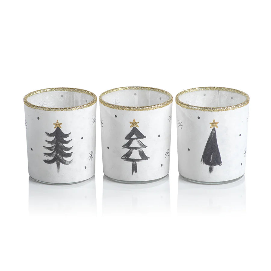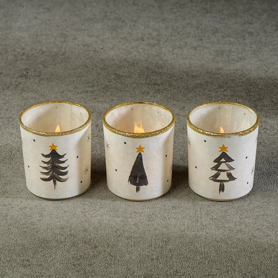 These Tree Glass Tea-light Holder Assortment add the perfect touch of holiday cheer to any room. With three different styles featuring Christmas trees delicately drawn on a white background and accented with scattered snow, these tealight holders bring a warm and festive ambiance to your home.