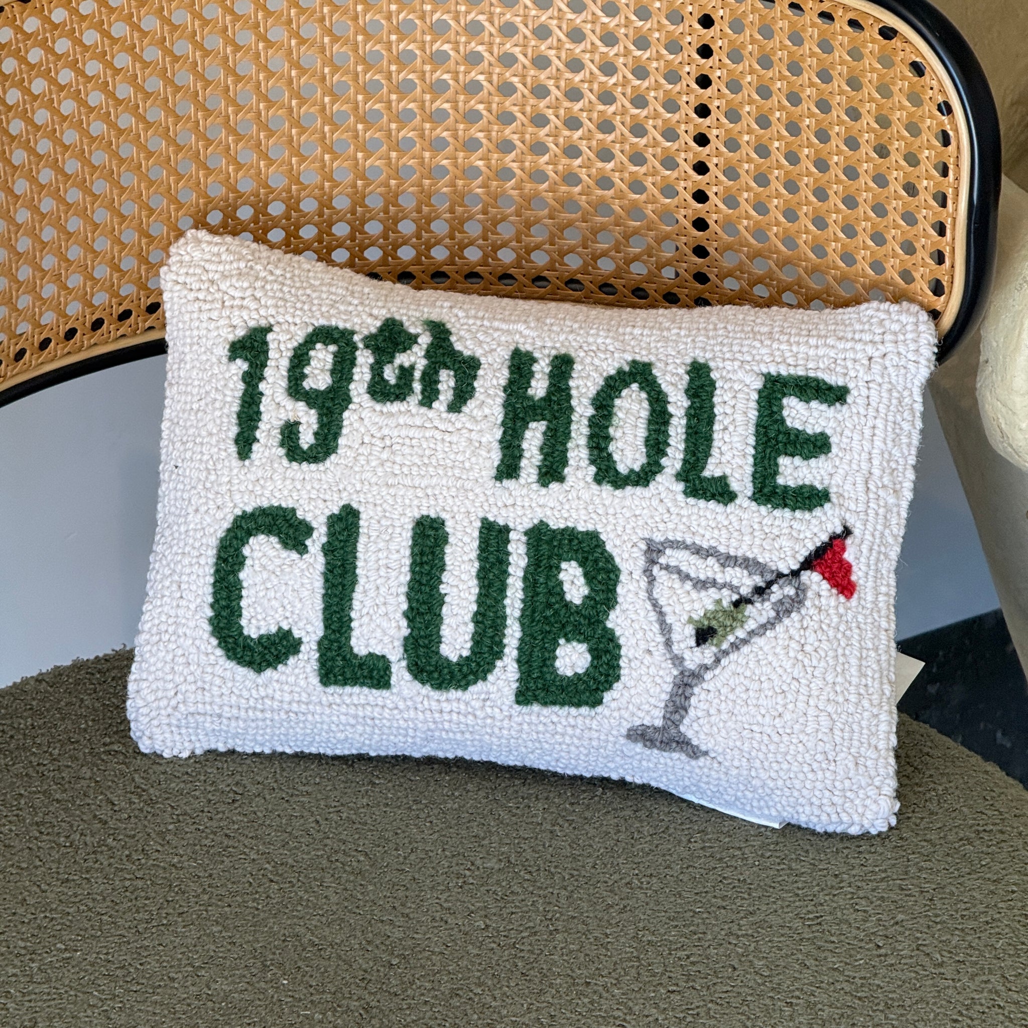 Four our Golf Lovers this 19th Hole Club Hook Pillow is a must have! Made from 100% wool and poly velvet, includes a polyester insert and zipper closure for easy washing.