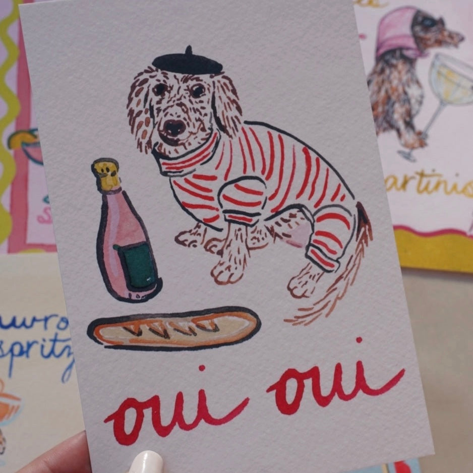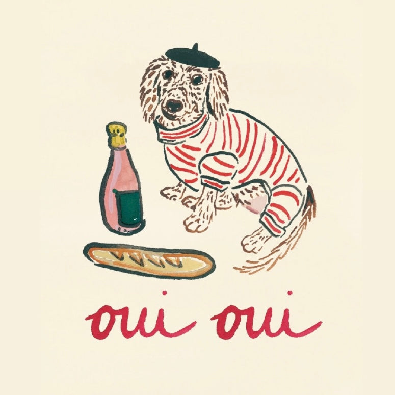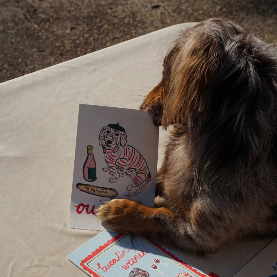 Dachshund Oui Oui Weenie Fine Art 5x7 Print by Artnikki. Features a French doxie with wine and a baguette, adorned with a beret and classic striped shirt. Modeled after artxnikki's own weenie dog, Indigo. It is printed on a cold press, watercolor textured paper. Acid free, archival, and very sturdy with a matte finish. Each print is made to order- printed, cut, and packaged by hand in my home.