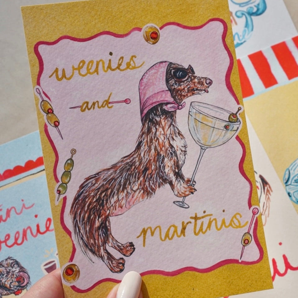 Weenies And Martinis 5x7 Art Print by Artnikki. features a doxie drinking a dirty martini adorned with a chic scarf and sunglasses. On a playful pink and green background with olives around the border. Weenie refers to dachshunds being called wiener dogs! Modeled after artxnikki's own weenie dog, Indigo. Each is printed on a cold press, watercolor textured paper. Acid free, archival, and very sturdy with a matte finish.