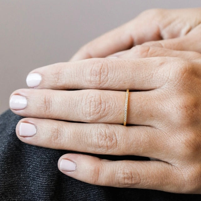The Half Pave White CZ Ring showcases a delicate 1mm band adorned with cubic zirconia stones, offering a refined aesthetic for both stacking and solo wear. Its tarnish-free coating ensures durability against moisture and sweat, while 5x more gold than standard 18k plating enhances longevity. Hypoallergenic and lead-free, it suits sensitive skin.