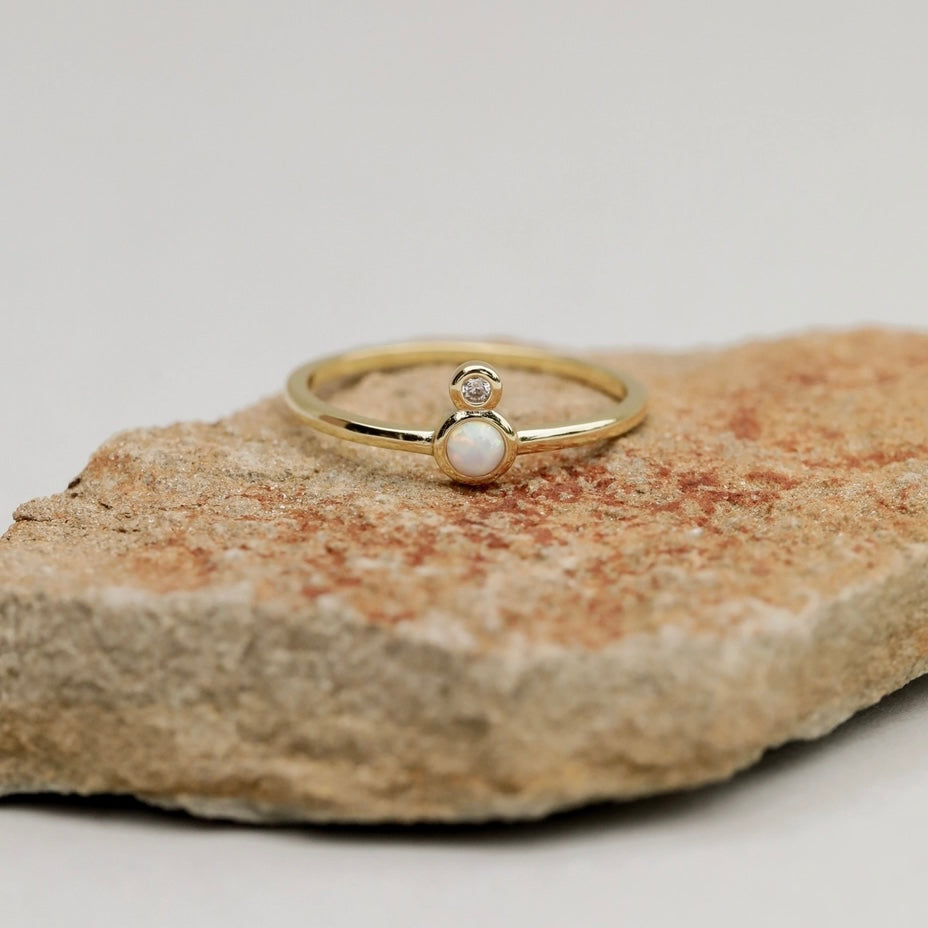 The Opal Infinity Gold Ring features a striking white CZ stone paired with a white opal, symbolizing balance and limitless potential. Its tarnish-free coating enhances durability, protecting against sweat and water. Available in sizes 6, 7, and 8, this ring combines elegance with practicality for everyday wear.