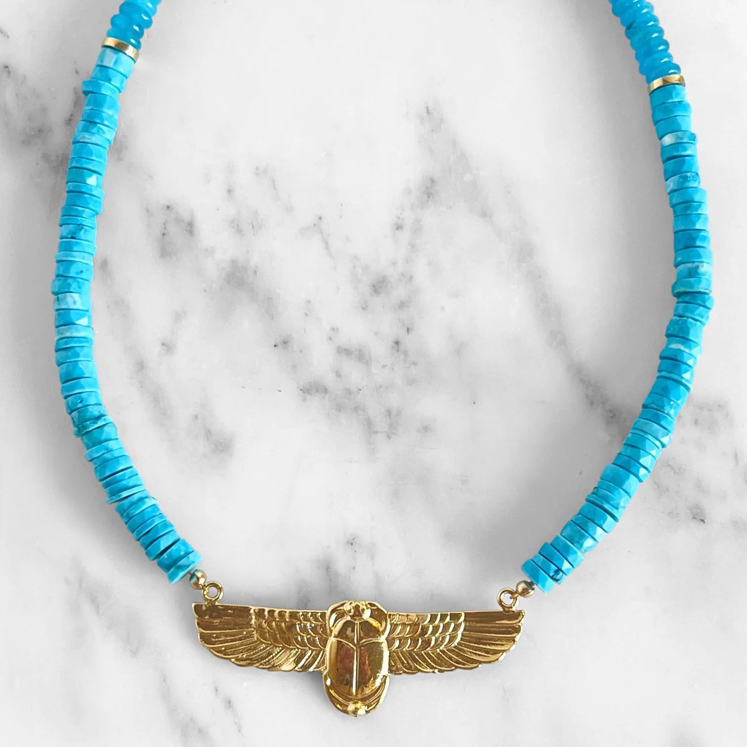 "The Ringo Necklace features a stunning, oversized gold beetle pendant with intricately designed wings, elegantly suspended between a strand of vibrant semiprecious blue stones. Make a bold statement with this unique and eye-catching necklace that adds a touch of glamour to any outfit."