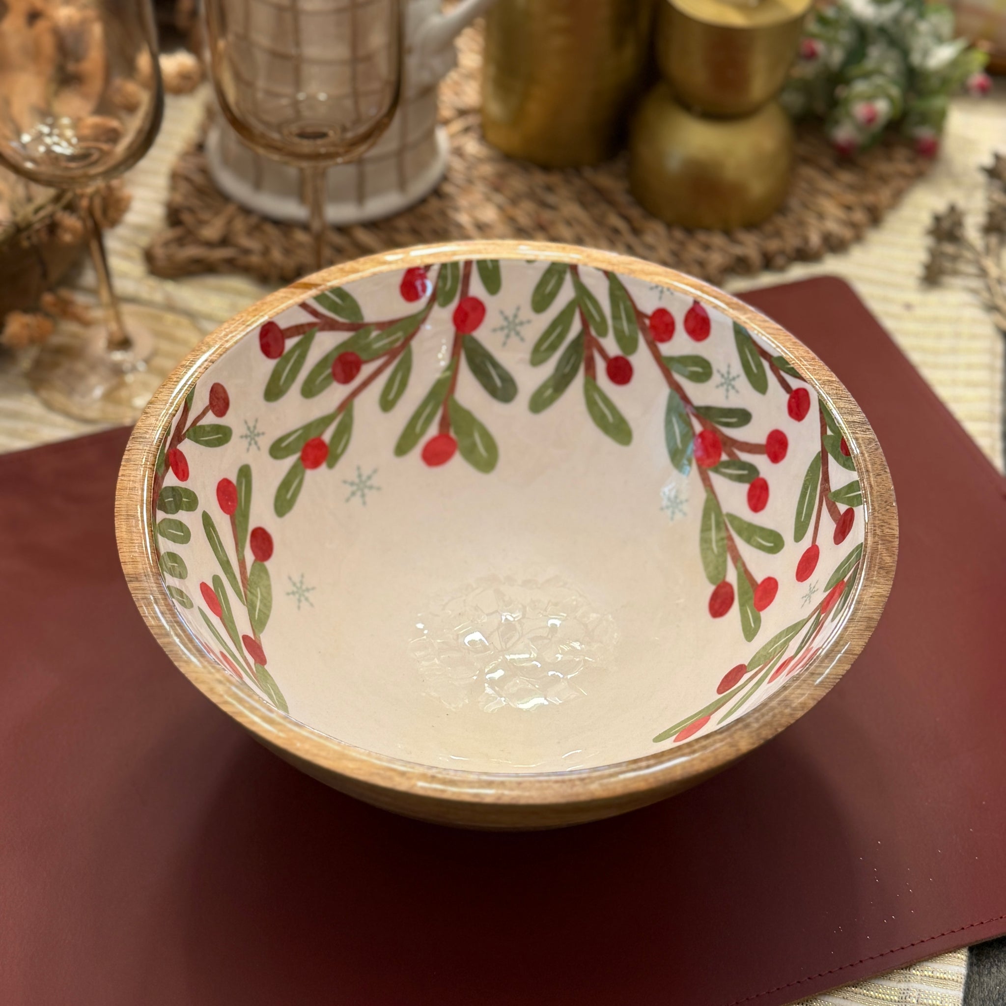 Expertly crafted from Mango Wood, this Winter Berry Holly Bowl is both functional and beautiful. The rich wood adds a touch of warmth to any gathering and the festive holly berry design adds a touch of holiday cheer. Perfect for serving your favorite dishes in style.