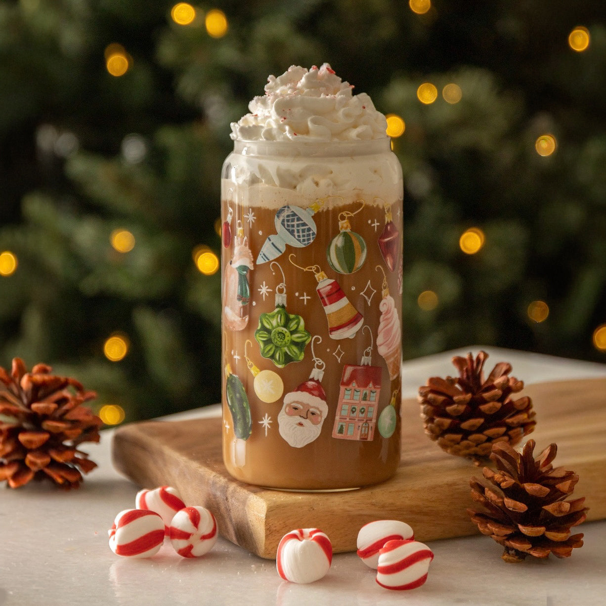 Around The Tree Glass Can, complete with a bamboo lid and straw. Features hand-painted vintage illustrations of classic decorations.