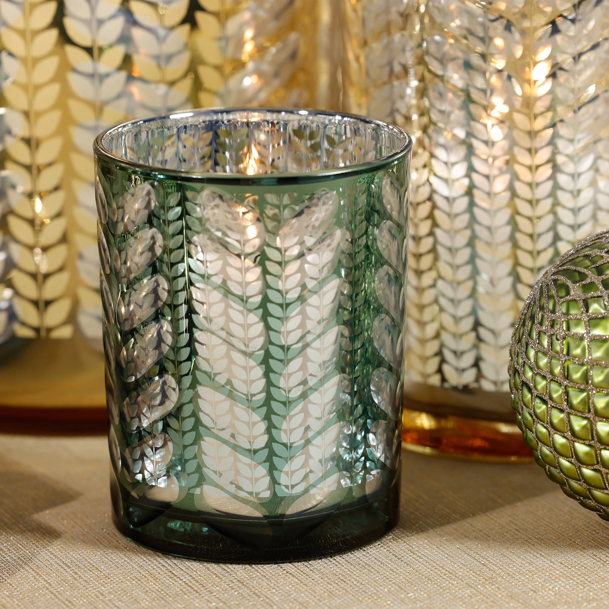 Illuminate any space with the stylish ZODAX Laser Etched Metallic Hurricane. Made with green metallic accents, the hurricane comes in two sizes small and large to fit your decor needs.